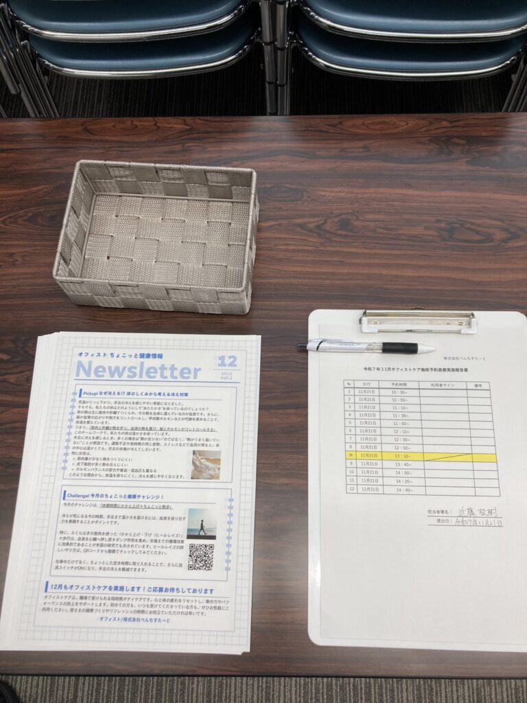 定期訪問ケアを実施しました(山口県周南市,健康経営認定企業) 周南市の契約企業様へ定期訪問し、4時間で12名の方へ、お一人20分のボディケアを行いました。お仕事の合間にリフレッシュしていただける時間をお届けしました。